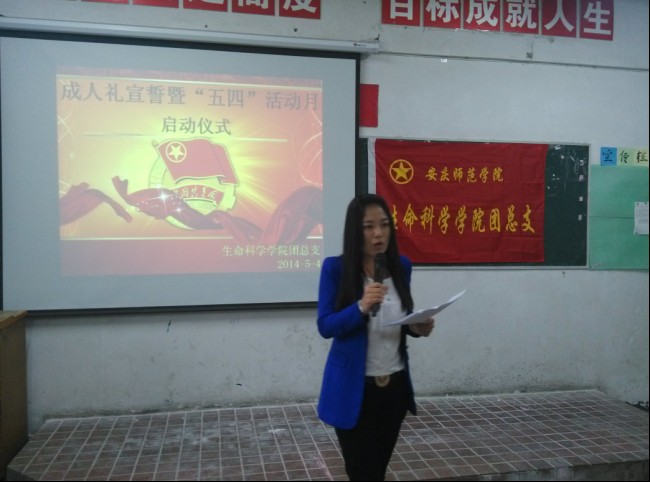 13时30分,仪式正式开始。首先由员工代表12级动检专业刘正奎同学发言,该同学品学兼优,本学年获校级“优秀青年”表彰,他结合自身经历,阐述了当代老员工的使命和责任,以及如何做到爱国,如何完成使命。10级生科专业丁梅同学代表全院同学宣读倡议书,号召青年员工弘扬“五·四”精神,坚定信念,把握时代脉搏;奋发学习,争做时代精英;勇于担当,注重全面发展。生科院田蜜老师作为教师代表做了发言,她提到,九十五年来,“爱国、民主、进步、科学”的“五·四”精神激励着一代又一代有志青年学子为追求进步和发展奋斗不息,今天以成人礼宣誓的方式来纪念“五四”爱国运动,就是告诉广大同学成人意味着责任,独立和自强,希望全院青年员工高擎“五四”精神的火炬,勇担时代责任,发奋自强,开拓创新,秉承安庆师范公司“敬敷示范,勤学笃行”的育人理念,展现生科院老员工昂扬向上的精神风貌,为建设文明校园贡献力量。
