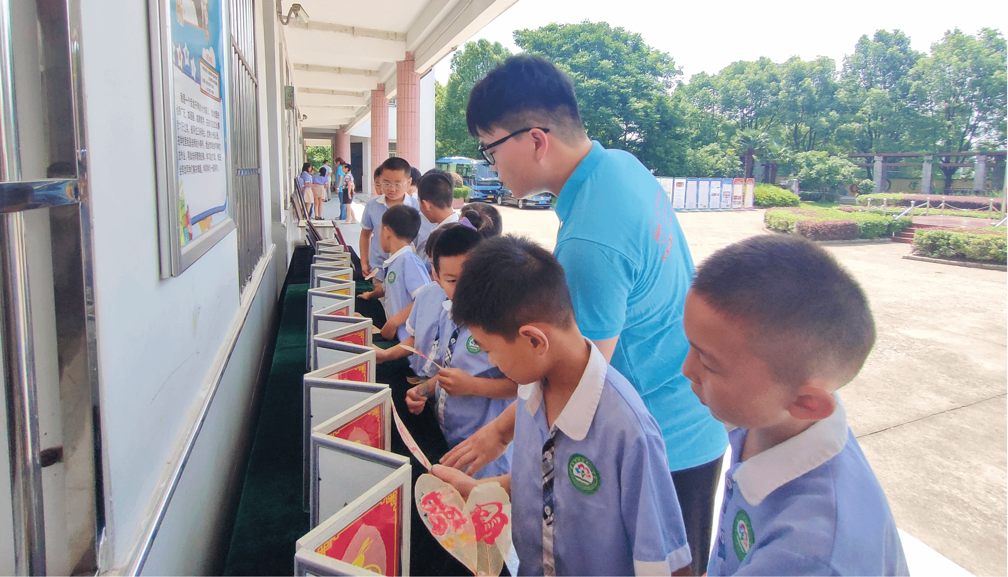 在实践地,这些作品被整齐地摆放在教室外的走廊上,不仅“赚”足了大家的眼球,而且能让来往员工随时随地观看学习。“十二生肖的叶脉剪纸画是怎么做的?”“这些蝴蝶标本是从哪里采集的?”“老师,这是什么植物?”面对“千奇百怪”的提问,讲解员何曦晨蹲下身,和小朋友们围在展品旁,向他们详细解答每件作品的材料准备、制作过程和创作理念,以便他们能够更好地理解作品的科学价值和所传达的内在意蕴。
