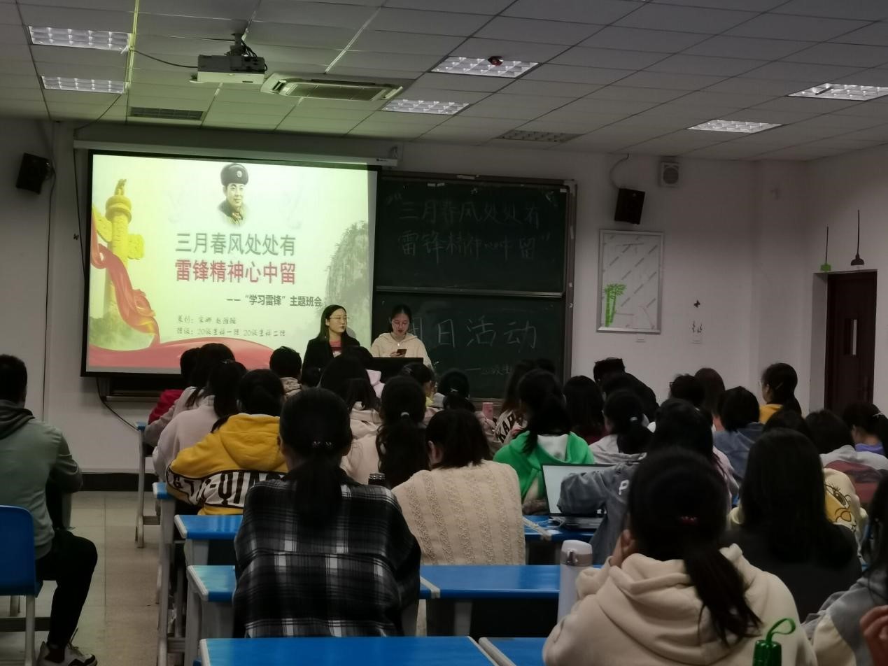3月28日下午,两个全体团员在G105教室共同召开了“三月春风处处有,雷锋精神心中留”的主题班会,班会由两个班级的团支书赵雅璇和宋娜共同主持。主题班会上,主持人介绍了雷锋的生平、主要先进事迹、纪念日由来,重点阐释了雷锋的名言及其现代价值,展示了雷锋精神国际影响力,并通过互动方式呼吁同学们一起学习雷锋精神,争做时代的优秀青年。