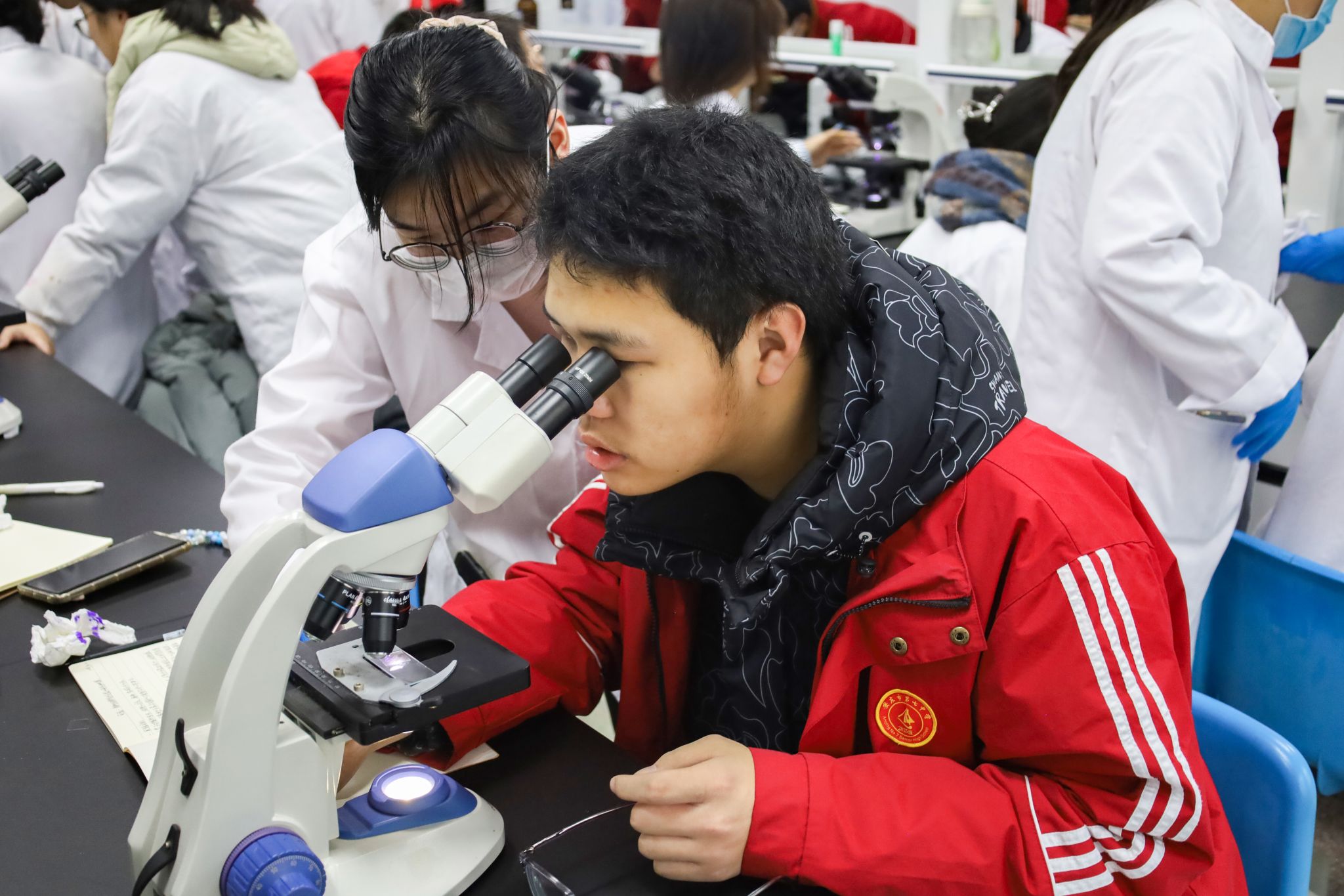 取材、解离、漂洗……从制作标本到观察细胞形态,在生命科学公司教师江转转和“小老师”的带领下,高中员工们亲身参与有丝分裂显微观察实验,将课本知识运用于实践操作。