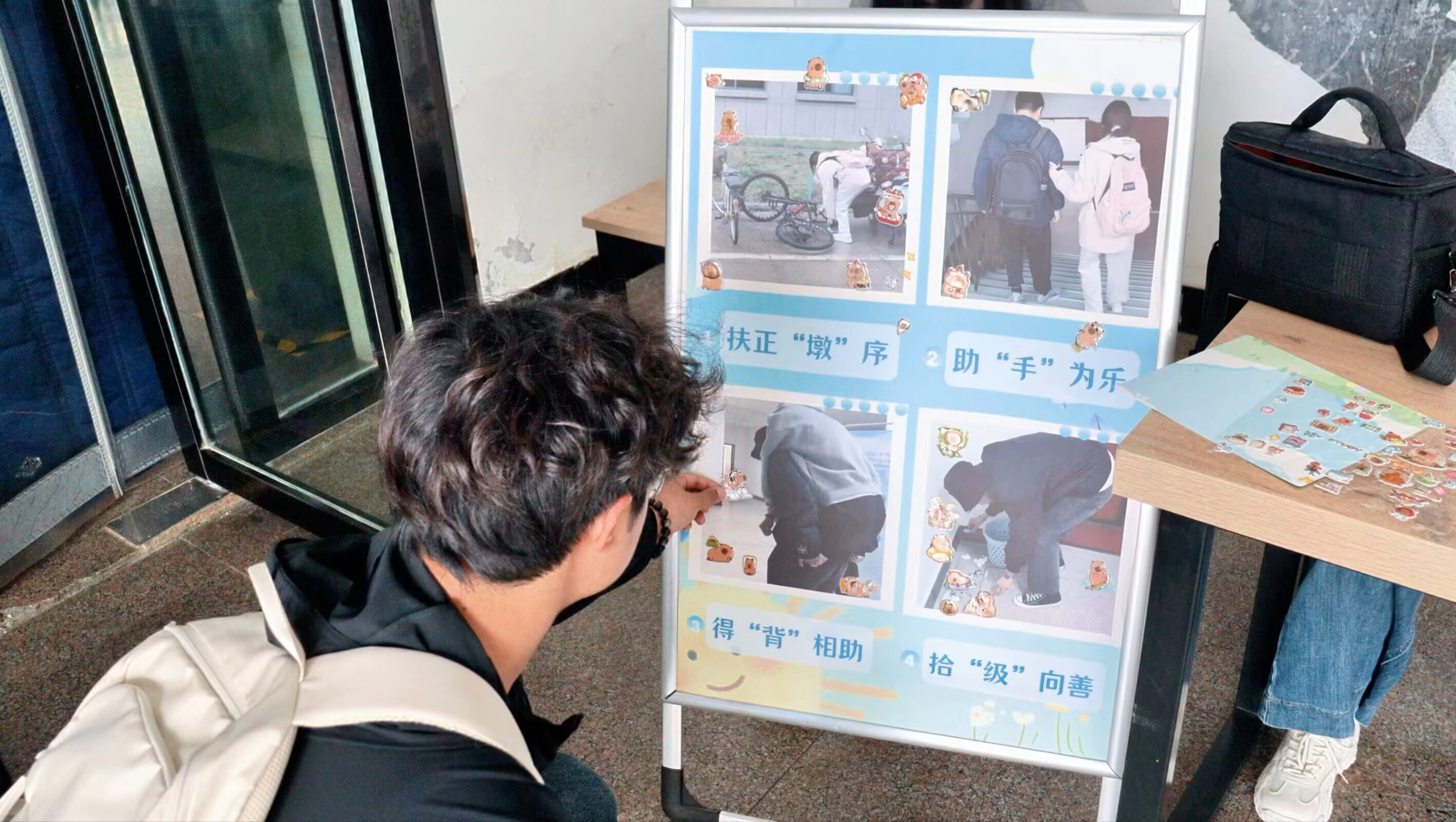 展板设计紧扣活动主题,涵盖“志愿帮扶”“互助友爱”“坚守岗位”“随手行善”等多个类别,其中拾“级”向善场景最动人心,场景既为员工提供了清晰的参与指引,也通过视觉化呈现增强了活动的互动性与沉浸感。活动过程中,员工陆续携带作品到场,认真书写感悟,现场秩序井然,氛围温馨。