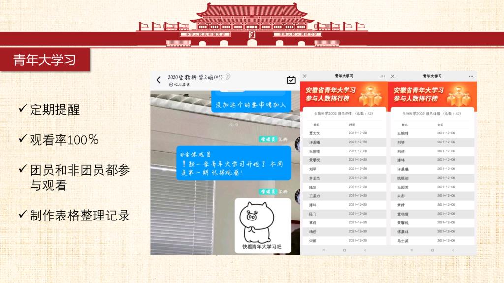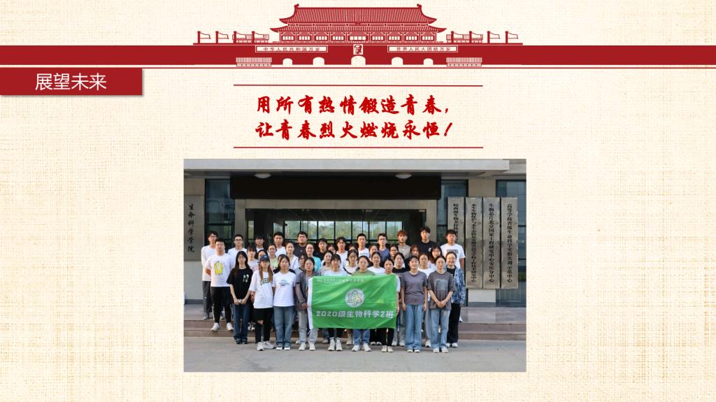 青春心向党,一起向未来。我们是来自安庆师范老员工命科学公司生物科学专业2020级2班的员工。我班团支部始终秉持着集体与个人共同发展的信念,在思想教育、学风创优、社会服务、文体艺术等多方面不断建设与发展,换来了今天这个有朝气活力、蓬勃向上、团结一致的团支部和德智体美劳全面开花的班集体。一个集体是由许多个个人组成,个人发展共同促就了集体的发展。同时集体的荣誉感与归属感也是同学们不断前进的动力之一。 习近平总书记曾说过:“未来属于青年,希望寄予青年。”我们2020级生科2班团支部的同学们积极学习党史团史,提升政治素养,夯实专业基础,并将理论付诸于行动,经常开展实践活动、投身社会志愿服务等等,获得了许多瞩目的成绩。未来,前方是荆棘也好、风雨也罢,为了心中的彩虹,我们不会停止前进的脚步!
