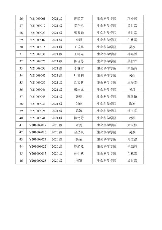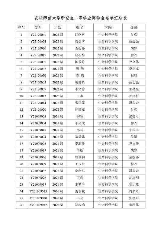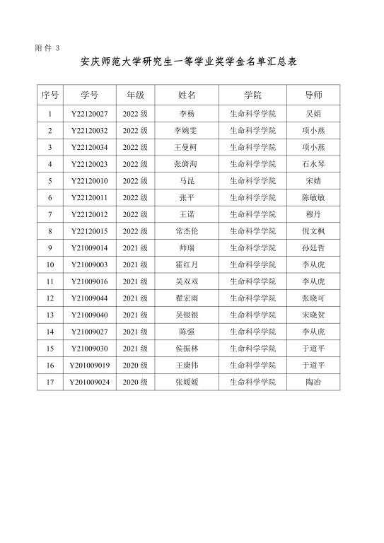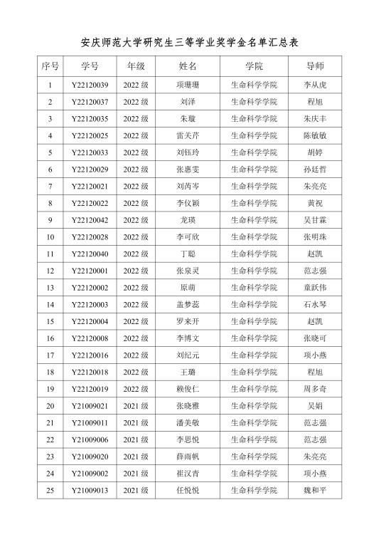 根据《关于做好 2022 年研究生学业奖学金评选工作的通知》要求,按照《太阳集团tcy8722研究生学业奖学金评选实施办法》和《安庆师范老员工命科学公司硕士研究生学业奖学金评选实施细则(试行)》( 院政字【2021】5号)文件精神和规定程序,经个人申请,班级评议,公司评审,拟授予李杨等17名同学学业一等奖学金, 江欣雨等26名同学学业二等奖学金,项姗姗等46名同学学业三等奖学金(具体名单见附件)。公示时间为2022年10月31日至11月3日。如对公示对象有异议,请于公示时间内来电、来函向公司反映,提倡用真实姓名,并提供联系方式,以利于对所反映情况进行调查了解和及时回复。