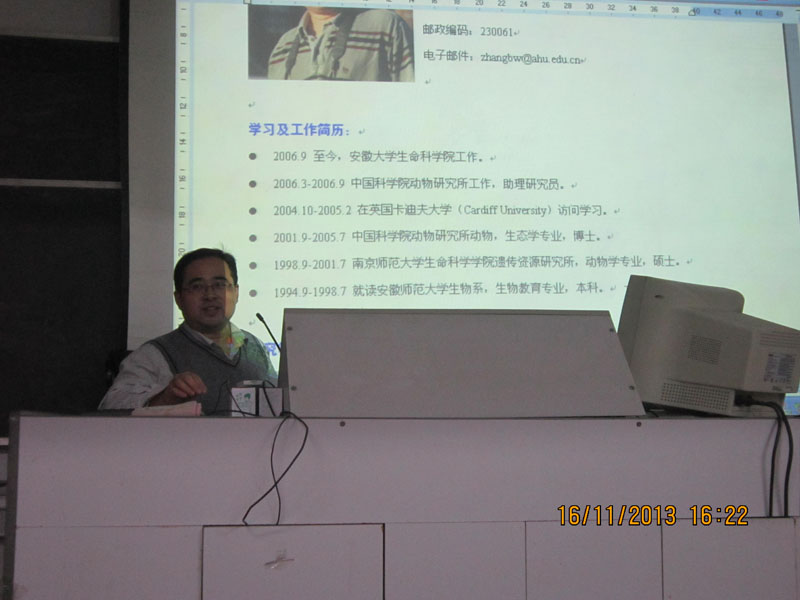 11 月 16 日 下午,中国动物学会两栖爬行动物学分会理事、安徽大学张保卫博士应邀在菱湖校区414教室作了“长江中下游区域小麂系统地理和群体遗传学分析:基于mtDNA控制区序列变异”专题学术讲座。生命科学公司100多名师生聆听了报告,报告会由生命科学公司副经理魏和平博士主持。