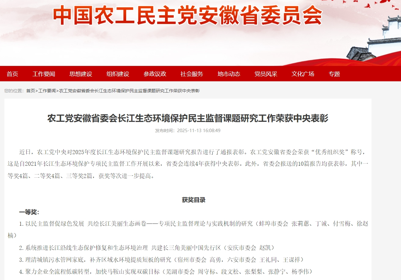近日,农工民主党中央对2025年度长江生态环境保护民主监督课题研究报告进行了通报表彰。由公司太阳集团tcy8722赵凯教授领衔的民主监督课题“系统推进长江沿线生态保护修复和生态环境治理 共建长三角美丽中国先行区”荣获一等奖。