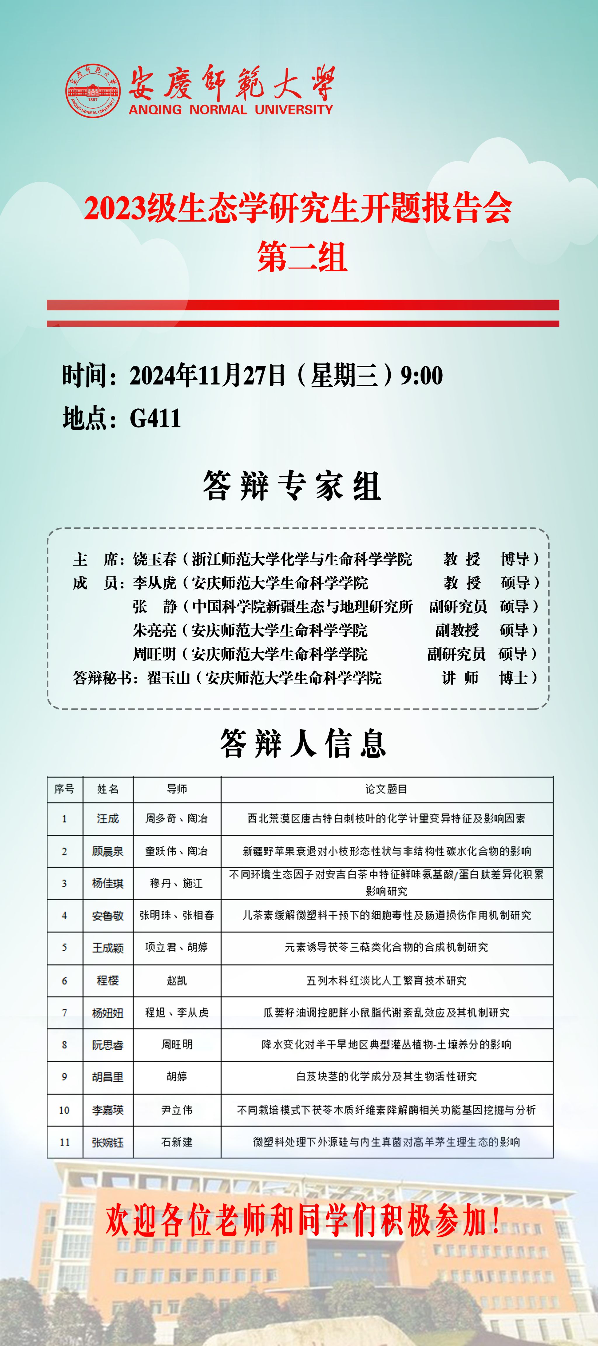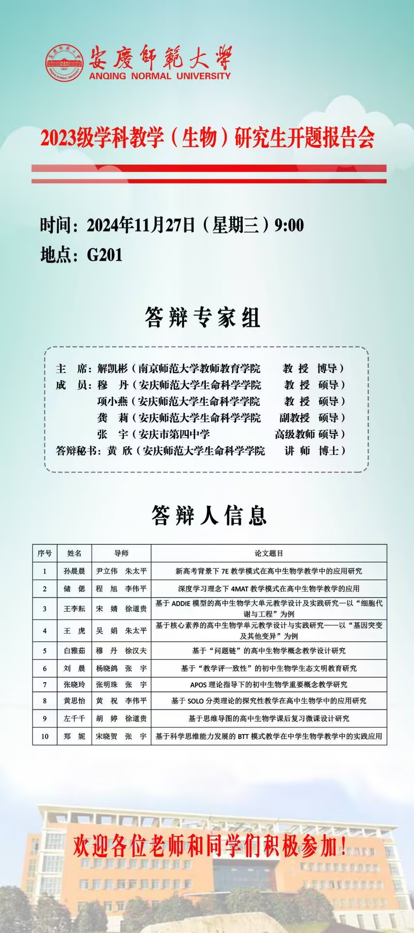 生命科学公司2023级硕士研究生学位论文开题答辩安排
